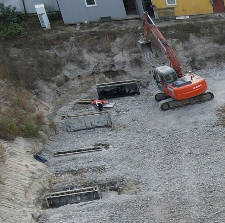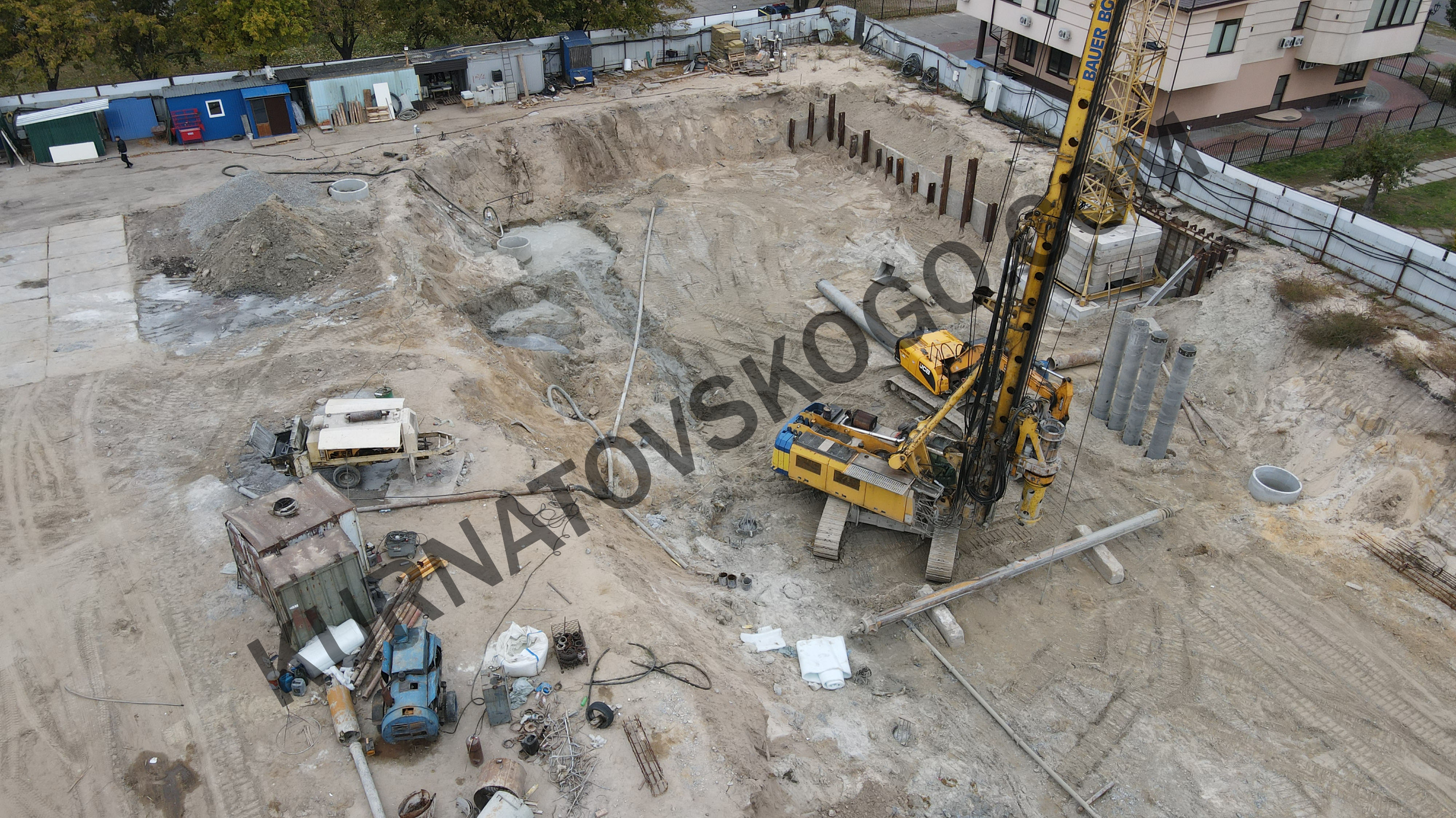 Работа кипит. Стационарный кран установлен, появился еще один самоходный кран. Добавилось экскаваторов. Появилось больше бытовок.