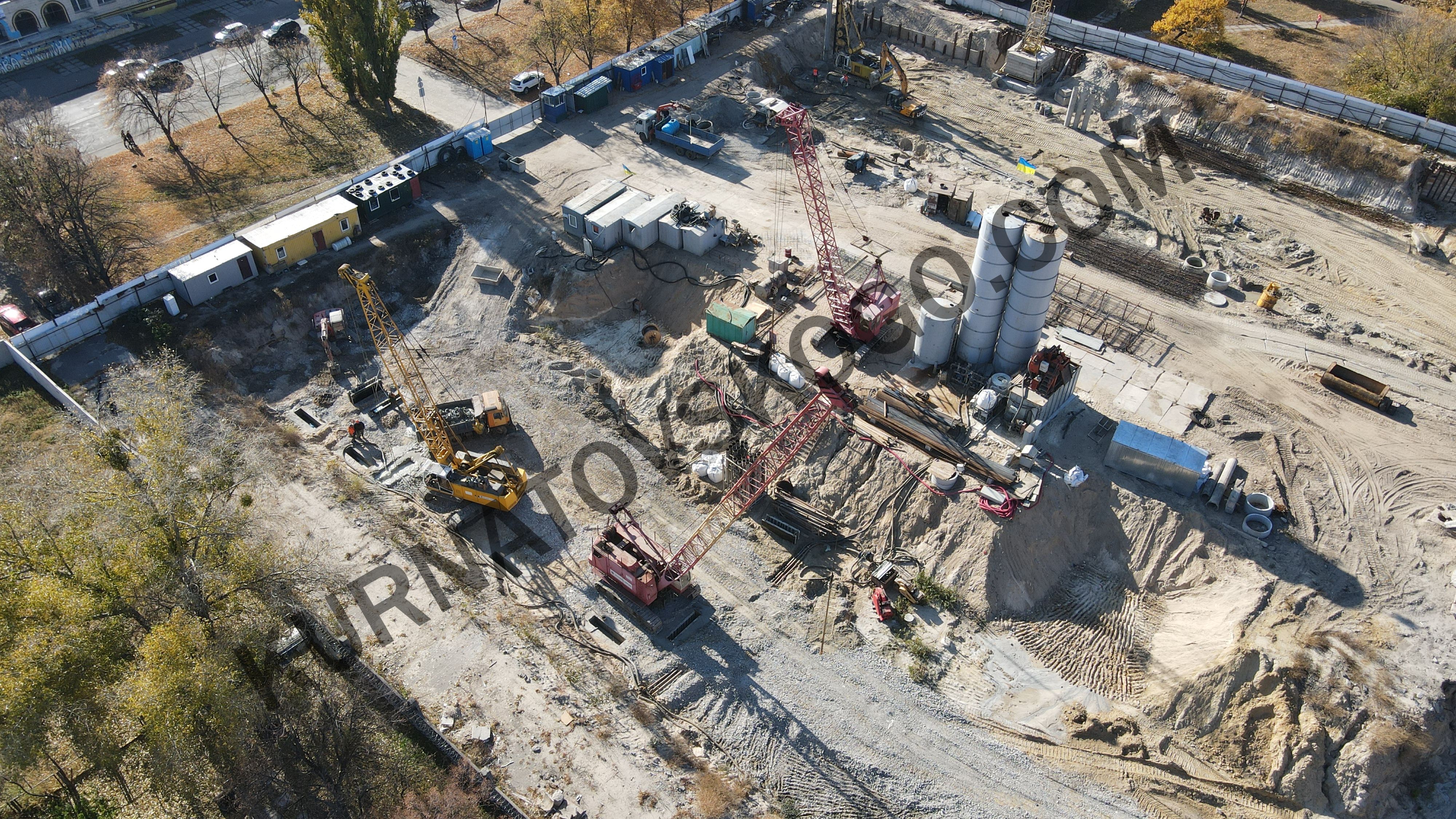 Работа кипит. Стационарный кран установлен, появился еще один самоходный кран. Добавилось экскаваторов. Появилось больше бытовок.
